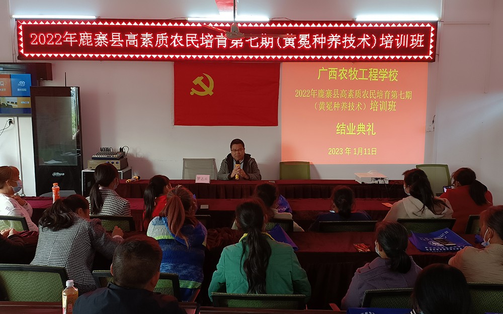 我校于1月6日至1月11日在鹿寨县黄冕村举办2022年鹿寨县高素质农民培育第七期(黄冕种养技术)培训班,我校继续教育部副主任刘佑东、鹿寨县农业农村局副局长陶倩文、高素质农民培训项目负责人罗志兵出席了开班典礼。来自黄冕村等村屯的45名学员积极参加了此次培训。