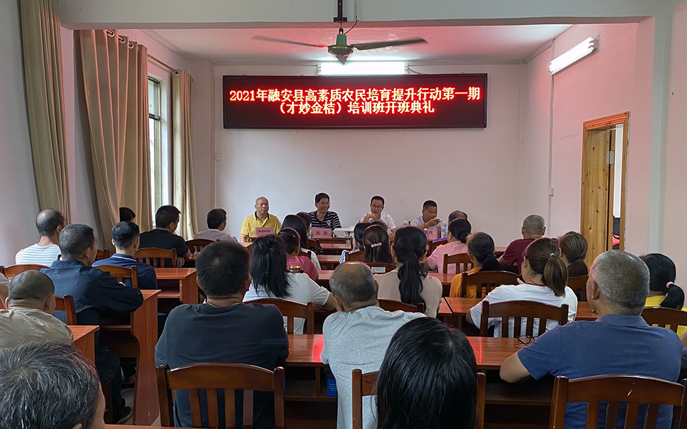 为了加快培育高素质农民经营主体,进一步促进农业增效、农民增收,为乡村振兴战略、发展现代农业提供人才支撑,我校近日在融安县才妙村委举办2021年融安县第一期高素质农民教育培训班,来自才妙村的54名学员积极参加了此次培训。