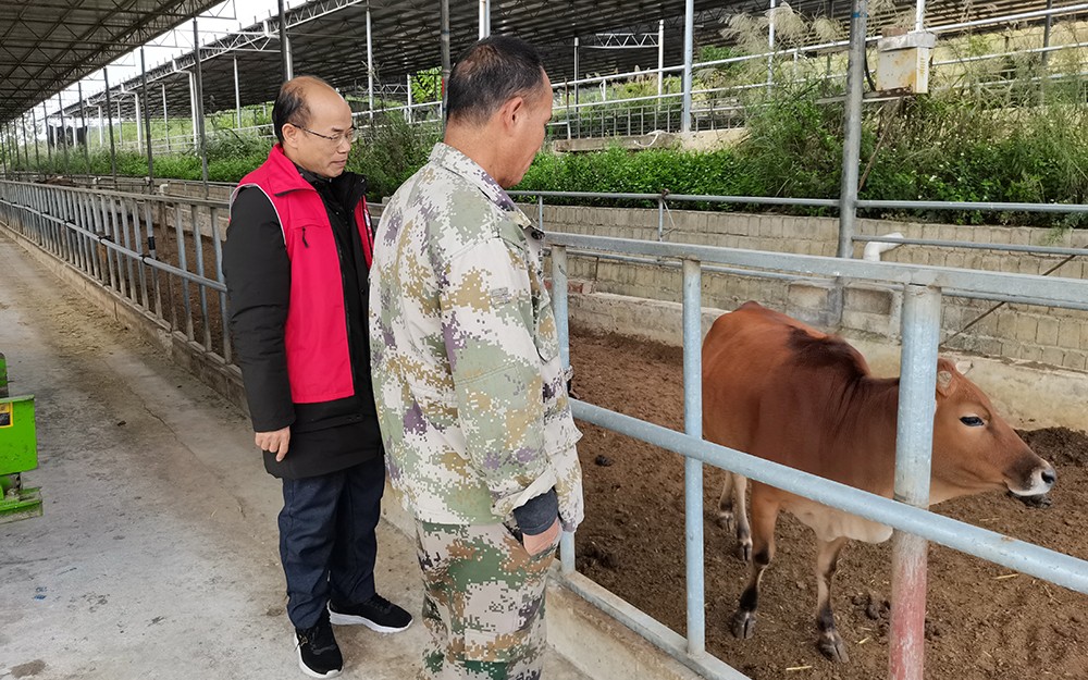 广西科技特派员梁炜在给养殖户进行牛的疫病防控指导