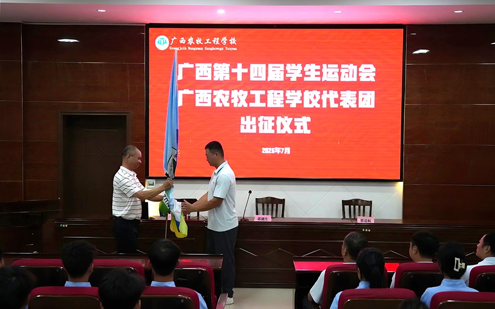 7月8日上午,学校办公楼阶梯教室洋溢着青春的热血与激情,广西第十四届学生运动会广西农牧工程学校代表团出征仪式在此隆重举行。校党委书记、校长蒋漓生,副校长瞿道航、马翠芳与全体教练员、运动员共同见证这一重要时刻,办公室主任石秀华主持仪式。