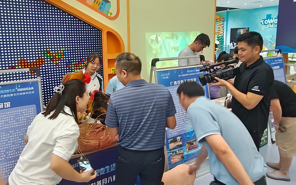 此次活动是广西首个科普月的重要组成部分,旨在弘扬科学精神,普及科学知识,提升全民科学素养。学校展区吸引了众多市民驻足观看,特别是青少年朋友们对展示的标本表现出浓厚的兴趣。最受欢迎的是名为“双雄争霸”的标本,为两只柳州麻花鸡争斗,此动物标本由我校柳州市柳北区非物质文化遗产传承人潘立老师团队制作。