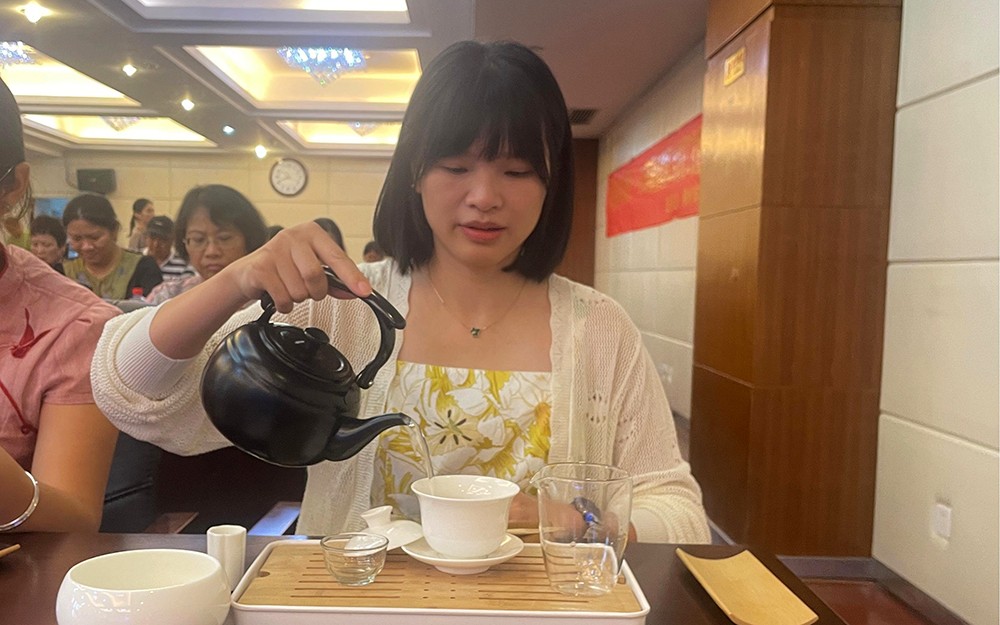 在茶艺体验区,广西技术能手陆奂岑老师以“生活茶艺冲泡方法”为主题,带领大家溯源茶文化、解码行茶礼仪。我校教师在实操中感受“温壶、投茶、注水”的仪式感,于茶香氤氲间舒缓教学压力,在一盏清茗中寻得内心宁静。