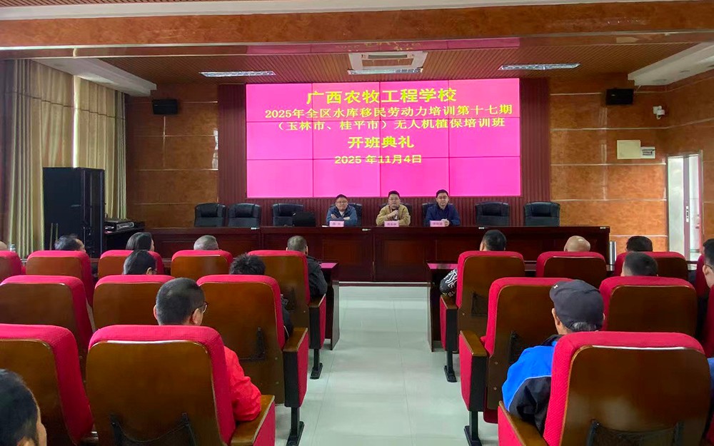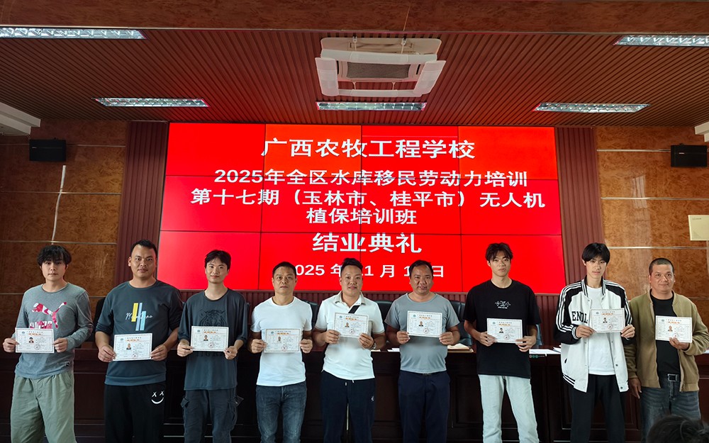 为助力乡村振兴、提升水库移民就业能力,11月17日,由学校承接的2025年全区水库移民劳动力培训第十七期(玉林市、桂平市)无人机植保培训班顺利结束。来自两地的102名水库移民学员,历经 15 天的系统学习与实操训练,圆满完成培训任务。