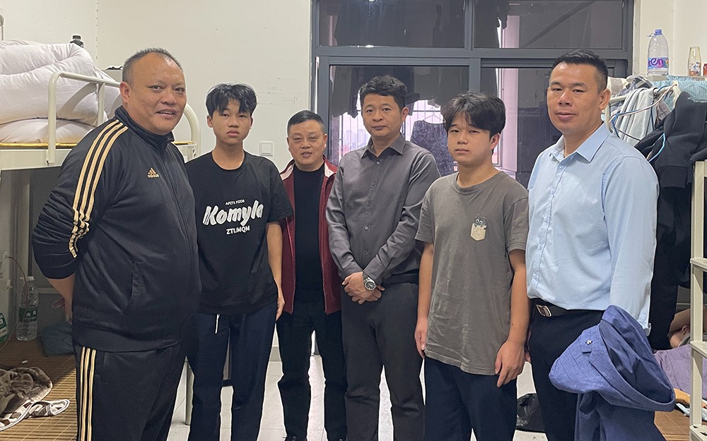 教师察看福日中诺宿舍与实习学生合影