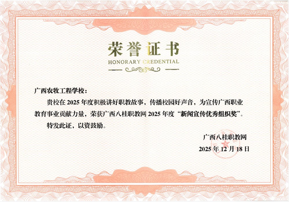 近日,学校凭借在新闻宣传工作中的突出表现,荣获广西八桂职教网“2025年新闻宣传优秀组织奖”,这是对学校深耕职教宣传、讲好农牧职教故事的高度认可与肯定。