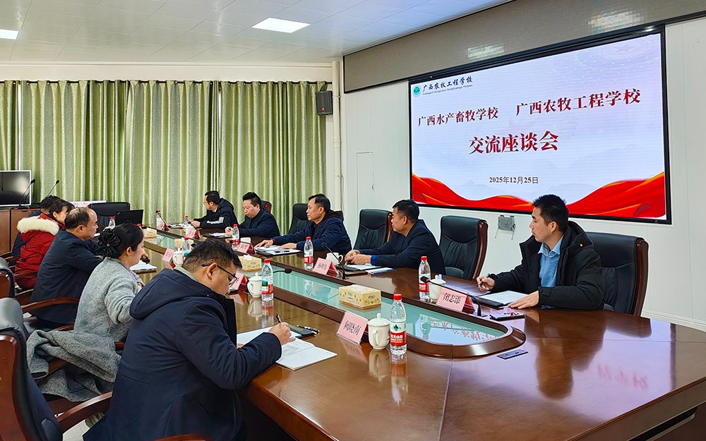 12月25日下午,广西水产畜牧学校党委副书记、校长黄仁望一行5人到我校开展交流活动,学校党委书记蒋漓生、副书记、校长邱少清及相关科室负责人热情接待并进行交流。