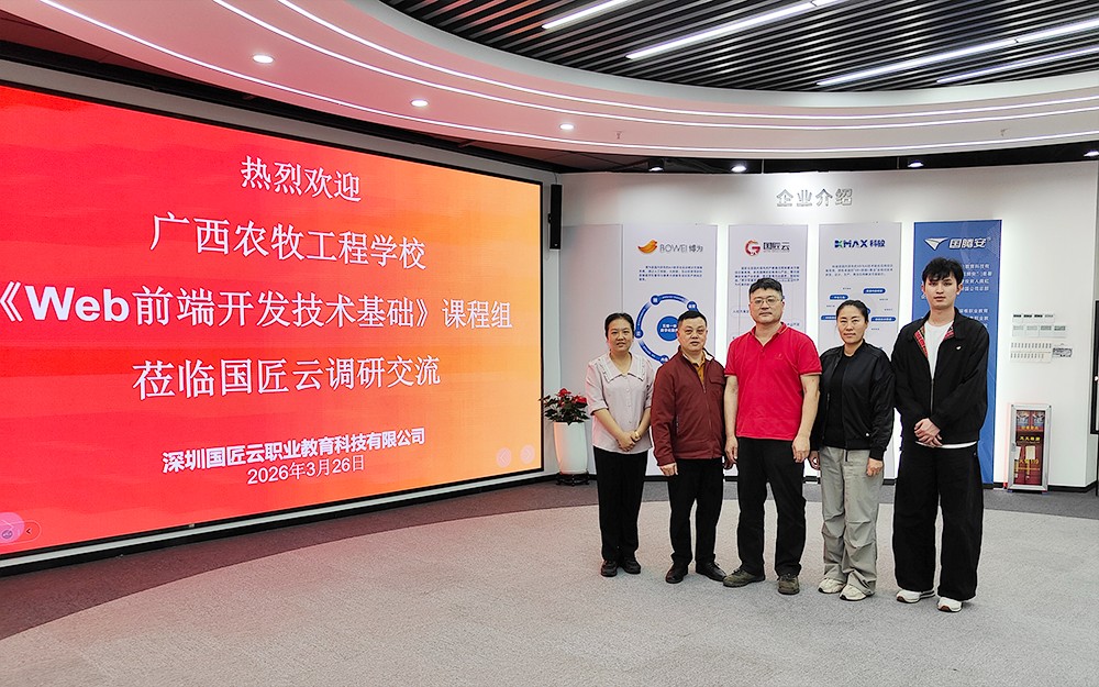 为深入推进计算机网络技术专业内涵建设,高质量打造《web 前端开发技术基础》精品课程,3月26日至27日,学校组织教师团队,前往深圳国匠云职业教育科技有限公司、广州南拓软件科技有限公司开展实地调研学习,以访企拓岗之姿,探寻产教融合新路径。
