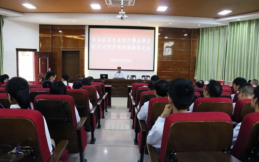 为贯彻习近平总书记关于打赢脱贫攻坚战的系列重要指示精神,落实桂农厅党组[ 2020 ]70号文件精神,激励事业单位工作人员在脱贫攻坚工作中不忘初心、牢记使命、干事创业、担当作为,我校于10月28日下午开展自治区农业农村厅事业单位脱贫攻坚专项奖励推荐大会,会议由蒋漓生校长主持。