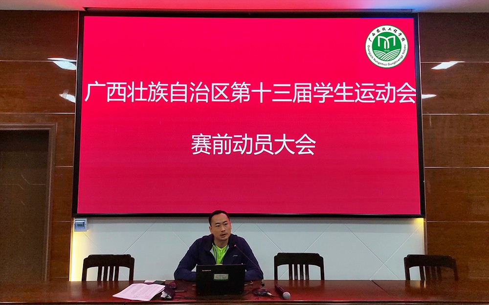 为了积极备战广西壮族自治区第十三届学生运动会,充分激发运动员的训练热情,5月18日下午,我校在阶梯教室举行了广西壮族自治区第十三届学生运动会赛前动员大会。出席大会的有学校副校长瞿道航、公共基础部负责人龚筱丽和全体教练员、参赛运动员。