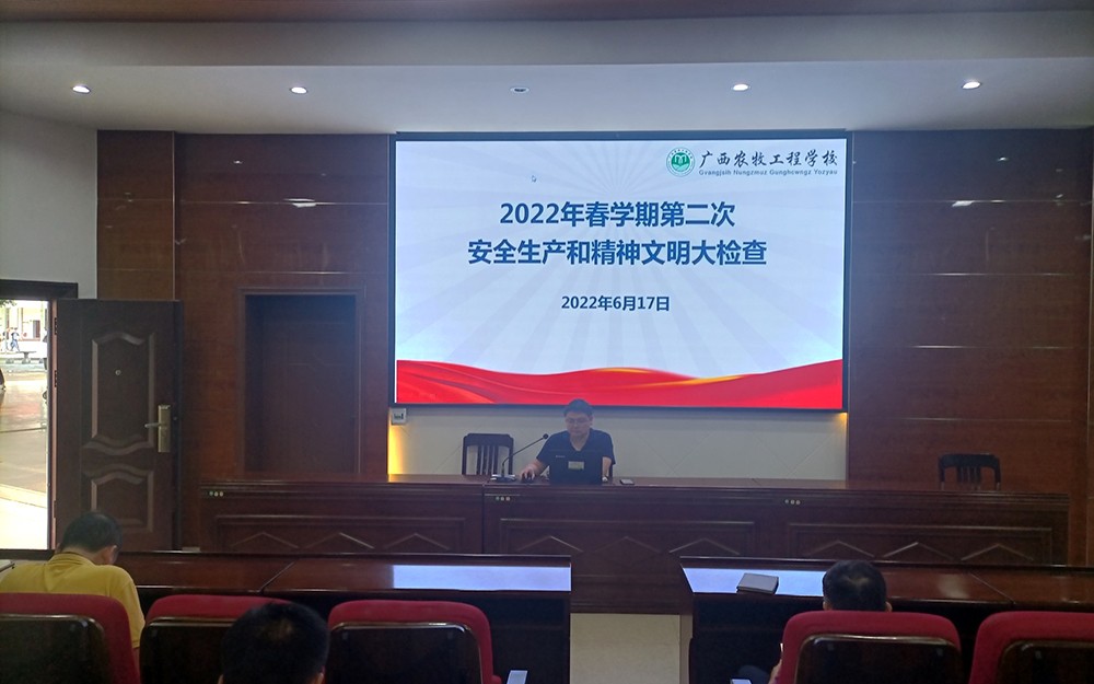 为贯彻落实自治区农业农村厅、教育厅、柳州市教育局有关安全生产和疫情防控的文件精神,持续推进2022年学校“安全生产月”活动,创造安全稳定的校园环境,结合我校实际,6月17日下午,我校开展了2022年春学期第二次安全生产和精神文明大检查活动。