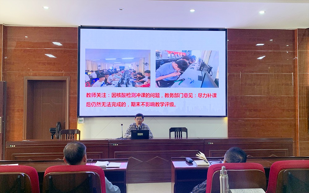 会上,教研督导室主任黄雪泉对本学期教育教学督导工作的整体情况作详细总结。秋学期开学至今,学校根据疫情防控要求先后开展线上线下教学模式,督导持续实行实时反馈制度帮助授课教师及时调整教学出现的问题,充分发挥了教学质量监控作用,有效的保障了教学质量。黄主任结合教师的课堂教学管理、学生上课状态与效果指出了存在的主要问题及改进意见,分享了听课过程中发现的表现突出的教师和教学范例。