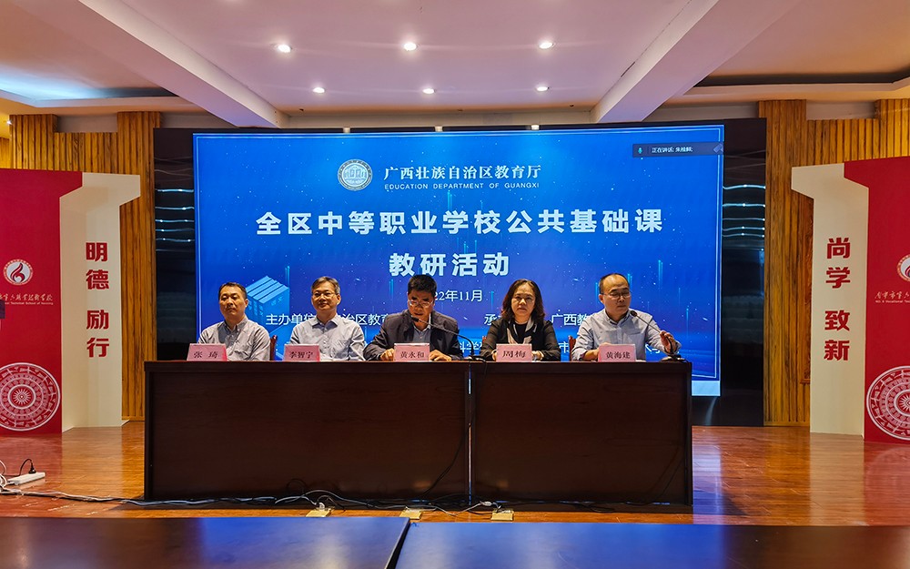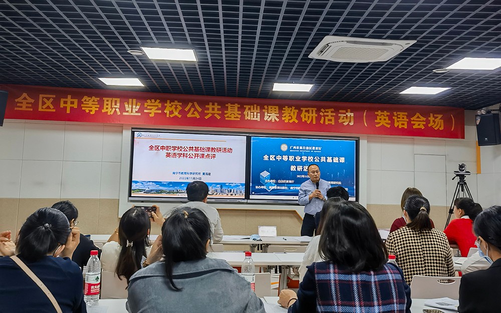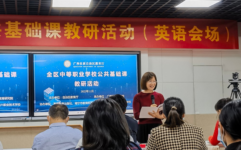 本次教研活动由自治区教育厅主办,广西教育研究院承办,高等教育出版社、南宁市教育科学研究所、南宁市第六职业技术学校协办。区内19所五星级中职学校的英语学科骨干教师受邀参加。此次教研活动采用半天教学方法讲座、半天优秀课例展示的形式进行,以线上线下相结合的方式开展。