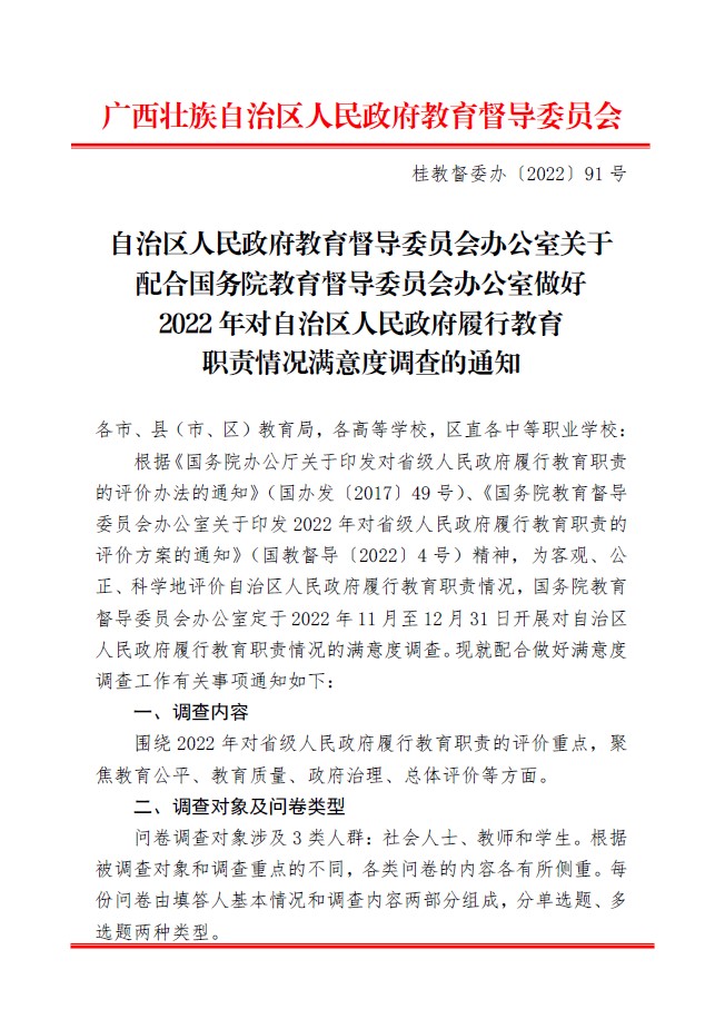 根据《自治区人民政府教育督导委员会办公室关于配合国务院教育督导委员会办公室做好2022年对自治区人民政府履行教育职责情况满意度调查的通知》(桂教督委办〔2022〕91号)文件精神,请我校广大师生积极参与对自治区人民政府履行教育职责情况满意度调查工作。具体操作请查看文件附件。