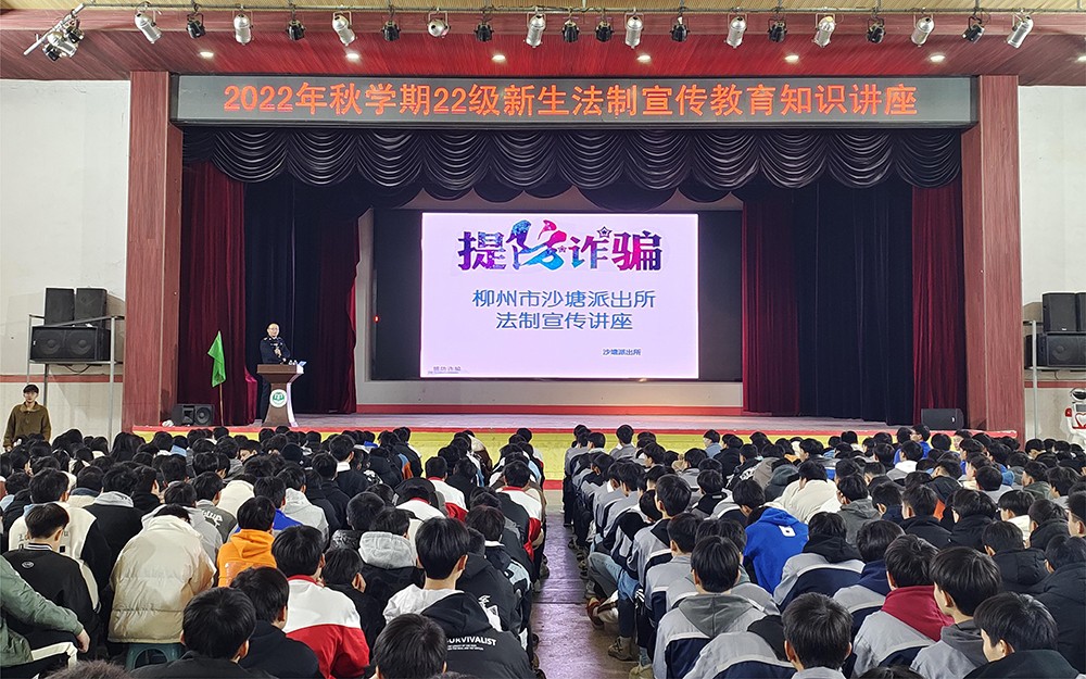 为了有效预防和打击各类诈骗犯罪,做好学校安全防范教育,进一步提高学生对各类诈骗的鉴别能力和自我防范意识,12月8日,学生科特邀柳州市沙塘派出所李一沣警官在学校大礼堂举行“提防诈骗”法治宣传专题讲座。共计450余名学生参加了此次讲座。