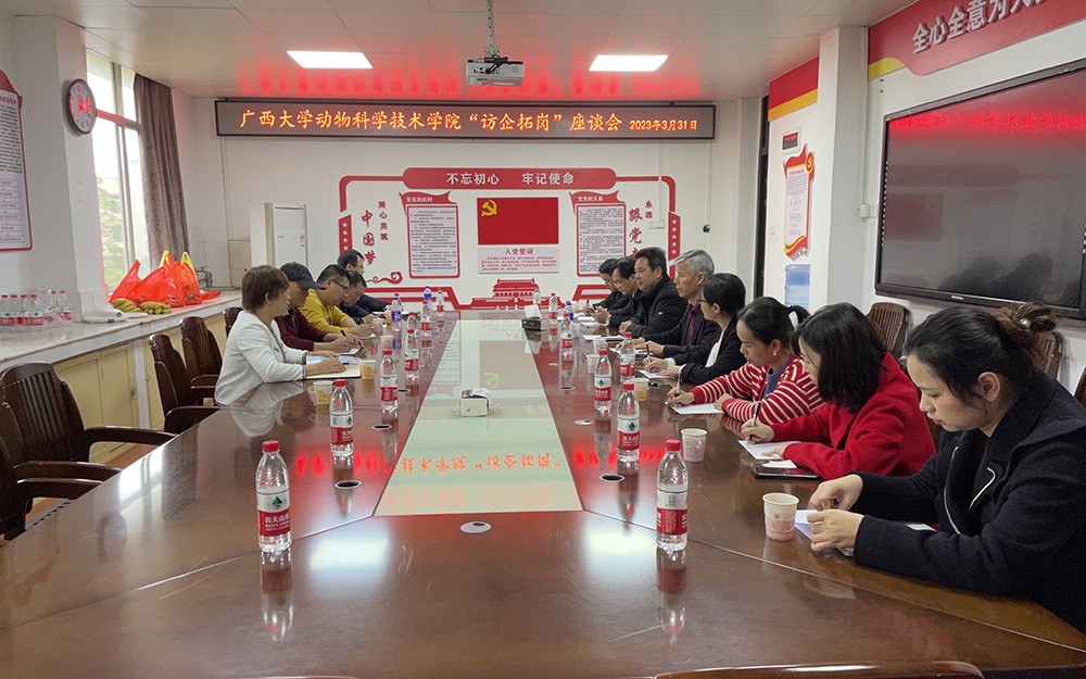 随后,广西大学动科院组织召开“访企拓岗”座谈会。动科院党委书记顾慕娴、党委副书记沙建与前来参加招聘会的广西农类高职中职院校的教师们亲切座谈交流。顾书记对各院校教师的到来表示欢迎,介绍了动科院师资力量、人才培养和科学研究等方面情况,也表达了希望各院校能为动科院的毕业生提供教师等就业岗位,吸纳优秀的本科和研究生毕业生。与会教师还就当下畜牧兽医行业企业人才需求、校企合作、畜牧兽医中高职学生升学等方面内容进行了深入探讨交流。