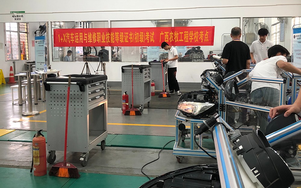 6月17日,我校2023年“1+X”汽车运用与维修职业技能等级证书(初级)技能考试在农机设备应用与维修实训室开考,2021级汽修专业学生参加此次考试。