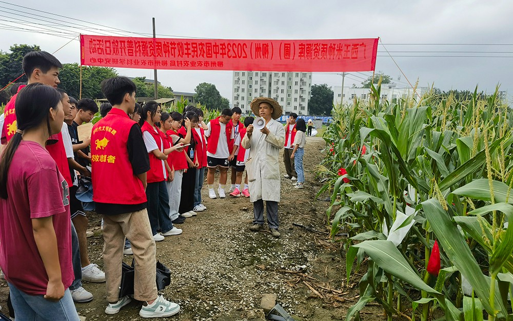 随后,同学们跟着科研人员的步伐前往现场参观广西玉米种质资源库(圃)(柳州)。柳州市农业科学研究中心副主任、高级农艺师莫武平以生动、有趣的语言,用丰富专业知识与实际操作经验,给同学们上了一场生动活泼的科普教育课。大家旺盛的求知欲与学习热情,也成为了田间地头一道亮丽的风景线!