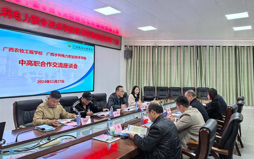 2024年11月27日, 广西水利电力职业技术学院来访嘉宾在土木建筑工程学院党总支书记梁中超的带领下,一行4人莅临我校开展中高职合作交流和对口招生宣传活动。我校党委书记、校长蒋漓生,招生就业办主任韦必辉,公共基础部主任韦怡,招生就业办副主任梁炜以及学生科副科长吴枫参加座谈交流。