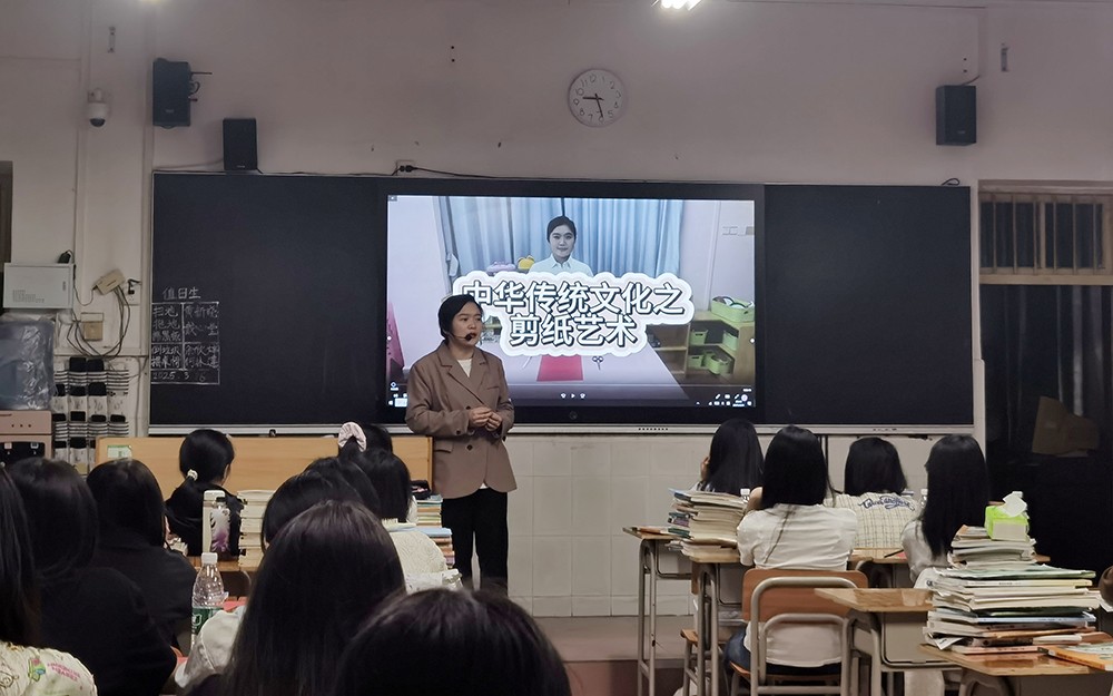 课堂上,彭婕老师充分展现了深厚的教学功底与创新精神。从剪纸艺术的历史溯源讲起,学生们了解到剪纸起源于古代祭祀,在明清时期走向鼎盛,2006 年更是被列入第一批国家级非物质文化遗产名录,系统地认知了这一传统艺术的发展脉络。在剪纸工具与别称的介绍中,同学们知晓了剪刀、刻刀的用途,还了解到它又被称为窗花、刻纸,拓宽了知识边界,让学生感受到传统艺术与现代生活的紧密相连。