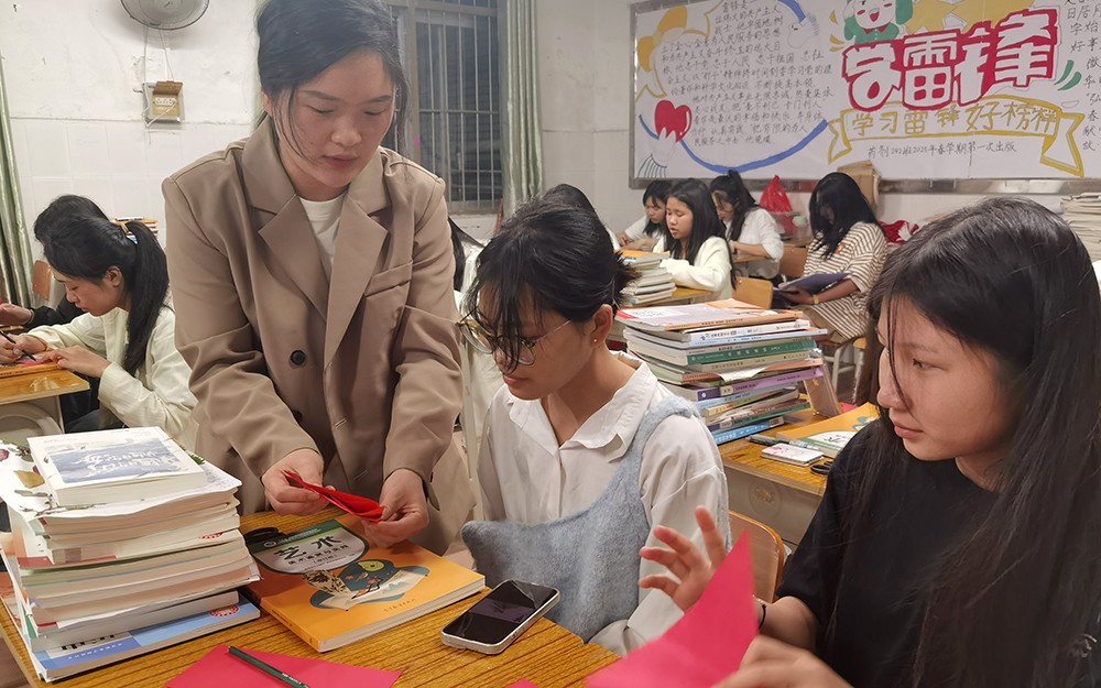实操环节是本次示范课的一大亮点。彭婕老师详细讲解了剪纸的每一个步骤,从多次对折并拉平、压平处理,到用铅笔轻画图案,再到沿阴影部分裁剪,转弯和尖角处放慢速度,每一个细节都指导得细致入微。为了满足不同学生的学习需求,老师亲自录制剪纸微课视频发布在学习通供学生观看学习,多样化的教学手段助力学生快速掌握剪纸技巧,并融入AI智能教学。