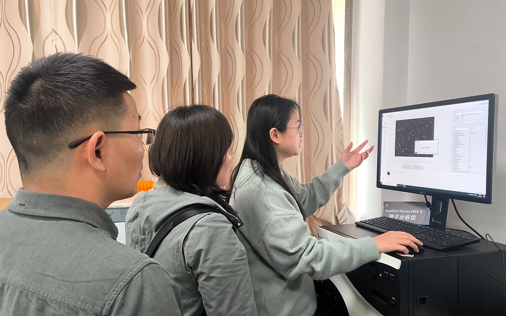扬翔集团秦佳丽(育种中心育种员,右一)展示繁育检验设备