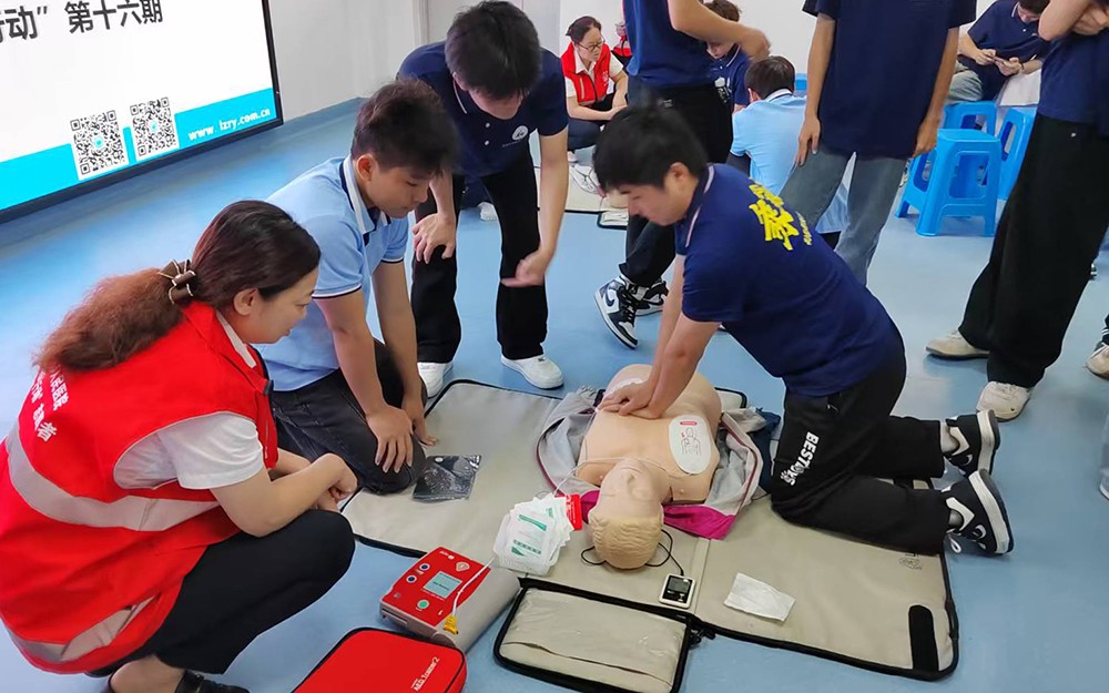 进入实训环节,王院长及医院医护人员借助模拟人、AED 模型、包扎道具等,手把手指导同学们进行实操练习。在徒手心肺复苏训练中,同学们依据 “看、叫、叫、看、按” 五字法进行操作。首先 “看”,观察周围环境是否安全;两个“叫”是先在患者两侧耳旁大声呼叫患者,然后叫旁人呼叫120,并告知具体地点及患者大概情况;再次 “看”,确认患者无呼吸或仅有濒死叹息样呼吸后,立即进行胸外心脏 “按” 压,按照标准的按压深度、频率进行操作,并配合人工呼吸。通过反复练习,同学们逐步掌握了这一关键急救技能。