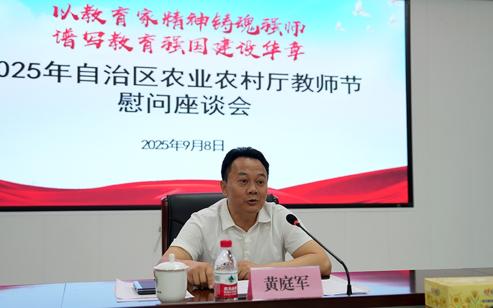 在第41个教师节来临之际,9月8日上午,自治区农业农村厅二级巡视员兼厅安稳办主任黄庭军带领慰问组莅临学校开展教师节慰问活动。在视频会议室召开慰问座谈会,学校领导、中层干部及教师代表39人参加。