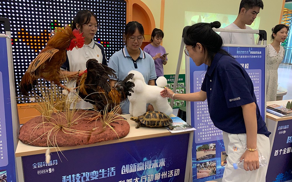 此次活动是广西首个科普月的重要组成部分,旨在弘扬科学精神,普及科学知识,提升全民科学素养。学校展区吸引了众多市民驻足观看,特别是青少年朋友们对展示的标本表现出浓厚的兴趣。最受欢迎的是名为“双雄争霸”的标本,为两只柳州麻花鸡争斗,此动物标本由我校柳州市柳北区非物质文化遗产传承人潘立老师团队制作。