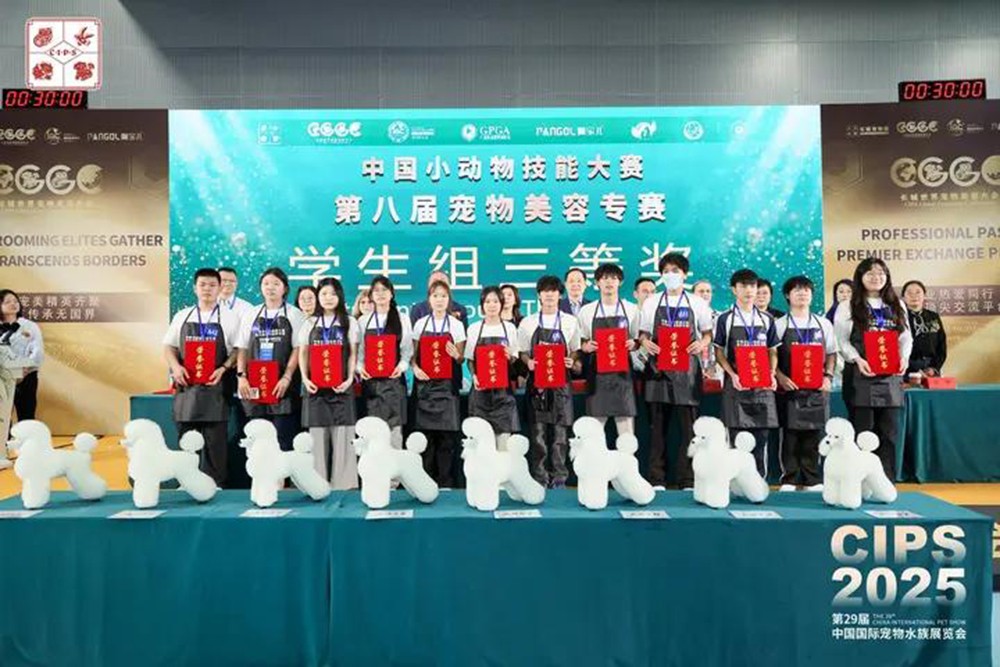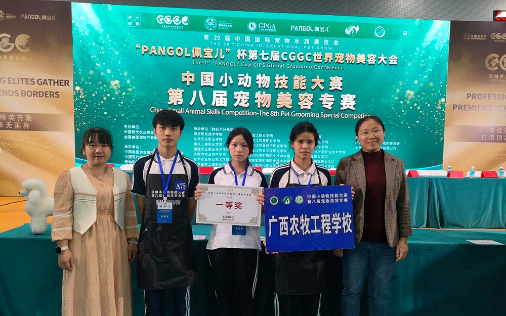 2025年11月15日,由中国兽医协会与中国现代农业职教集团联合主办的中国小动物技能大赛第八届宠物美容专赛在中国进出口商品交易会展馆圆满落幕。学校教师刘亮、黄虹宁带队,韦春慧、罗志玲、甘传勤三名学生组成的参赛团队,在全国大中专院校优秀选手齐聚的竞技舞台上奋勇拼搏,凭借扎实的专业功底和出色的实操技能脱颖而出,一举斩获一等奖、二等奖、三等奖的优异成绩,为学校赢得了荣誉。