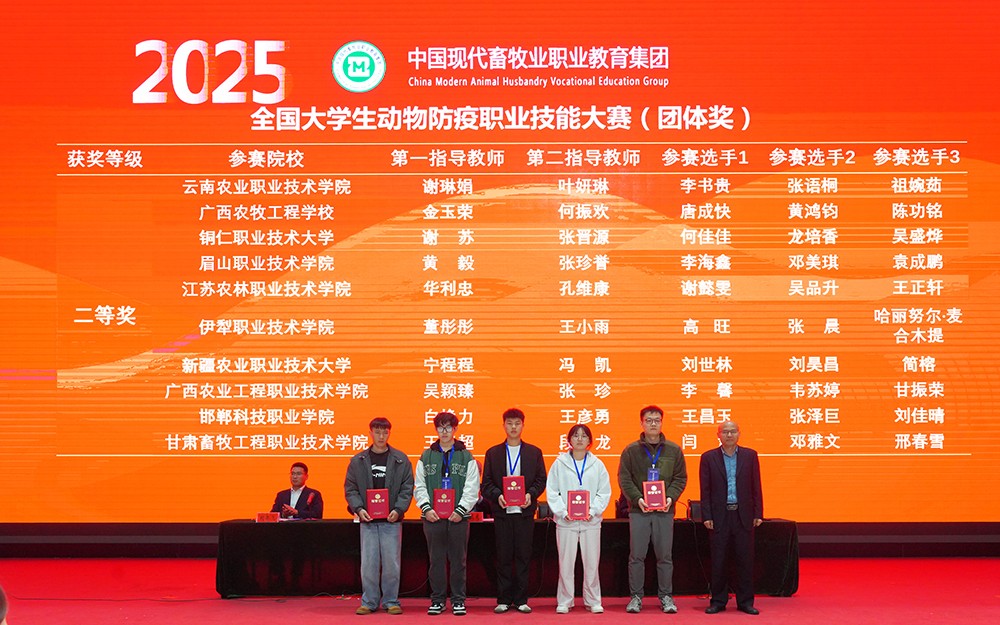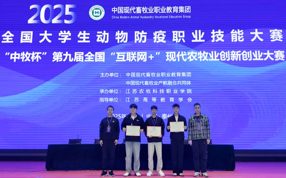 2025年11月9日,全国大学生动物防疫职业技能大赛争夺赛在江苏农牧科技职业学院隆重举行。本次大赛汇聚了来自全国15个省、自治区的18所高校代表队,堪称动物防疫职业技能领域的“巅峰对决”。在我校金玉荣、何振欢老师的精心指导下,黄鸿钧、陈功铭、唐成快三位同学代表学校出征,与各路精英同场竞技,经过激烈角逐,最终斩获团体二等奖一项、个人二等奖二项,实现了我校在全国大学生赛事中的历史性突破。
