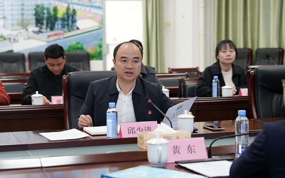 随后,双方相互介绍了与会人员。我校党委副书记、校长邱少清同志代表学校发表了热情洋溢的致辞。他详细介绍了我校的办学历史、发展现状、专业布局、师资队伍建设以及未来发展规划,并再次表达了对黄东校长一行的诚挚欢迎。紧接着,玉林市第一职业中等专业学校黄东校长也介绍了其学校的基本情况,分享了玉林一职在办学特色、人才培养及校园文化建设等方面的经验与成果,并对我方的热情接待表示感谢。
