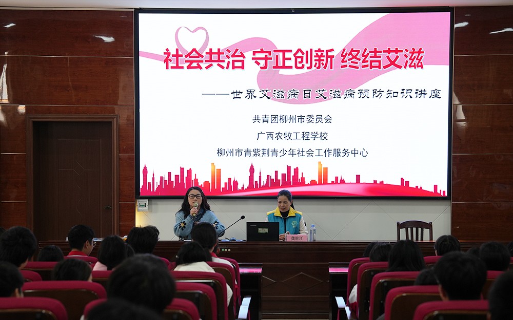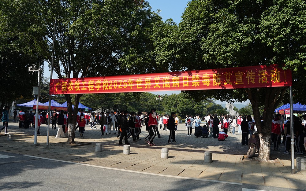 2025年12月1日是第38个“世界艾滋病日”,为持续推进艾滋病防治宣传工作,提升青少年的防艾意识和能力,营造全社会参与防艾工作的良好氛围,结合共青团实际。由共青团柳州市委员会、柳州市卫生健康委员会、柳州市教育局联合主办,柳州市青紫荆青少年社会工作服务中心与广西农牧工程学校共同承办的2025年“世界艾滋病日”主题宣传活动在校成功举行。来自全校各年级的师生代表共计500余人参与活动。通过“知识讲座 + 主题游园”双轨并行的创新形式,构建起全方位、沉浸式的防艾宣传阵地。