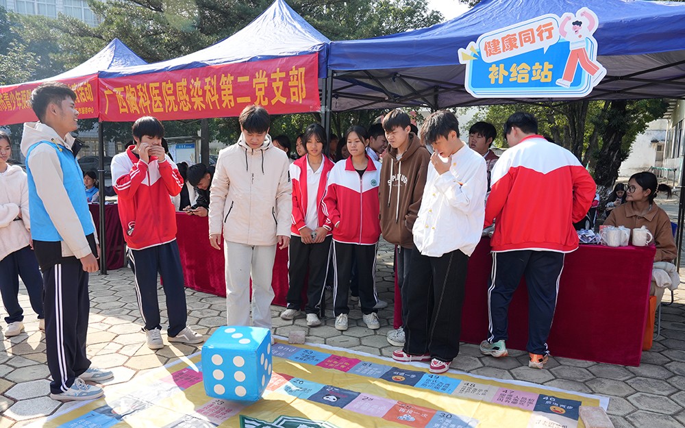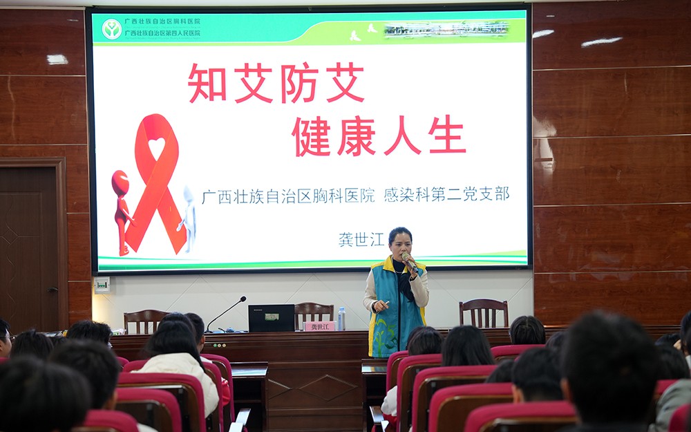 活动当天,两大核心环节同步开展、互为补充。在校阶梯教室,柳州市12355志愿者服务站特聘专家龚世江老师带来了一场专业详实的防艾知识讲座。讲座结合青少年成长特点,以通俗易懂的语言系统讲解艾滋病的传播途径、预防措施及国家相关帮扶政策,重点纠正“日常接触会感染” 等认知误区,强调“科学防护”与“消除歧视”的重要性。不少学生表示,讲座内容贴近生活、实用性强,彻底打消了此前对艾滋病的盲目恐惧。