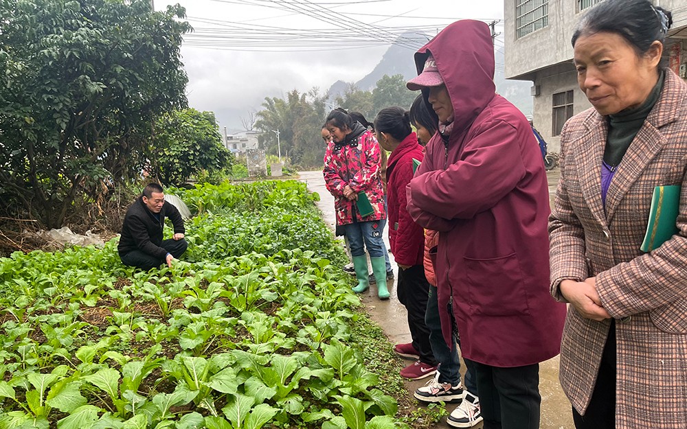 本次跟踪回访服务通过实地走访、田间交流等形式开展。学校邀请授课教师韦建学参与此次回访。首先韦老师热情地与学员打招呼,深切地表达对学员的关心和问候,让整个回访气氛渐渐进入状态。其后韦老师与学员进行深入的交流,了解学员的学习实践情况,针对当季蔬菜产业的整体状况、品种预选、市场行情等方面进行了透彻的分析。最后全体人员下到菜园子进行实地访查,韦老师对当前蔬菜的常规管理、病虫害防治等问题进行了指导。