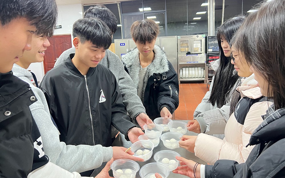 另一边,旅游251班的同学们则以专业服务标准,扛起了元宵核心环节的重任。从汤圆的下锅煮制到分装摆盘,大家分工协作、有条不紊。烧水、下汤圆、轻轻搅拌防止粘连,每一个步骤都细致入微;待汤圆浮起、软糯香甜时,同学们将其盛入精致的碗碟中,搭配暖心的问候,逐一送到烹饪班同学和现场老师手中。他们规范的服务流程、亲切的微笑礼仪,完美诠释了旅游服务专业的职业素养,成为实训基地里一道温暖的风景线。