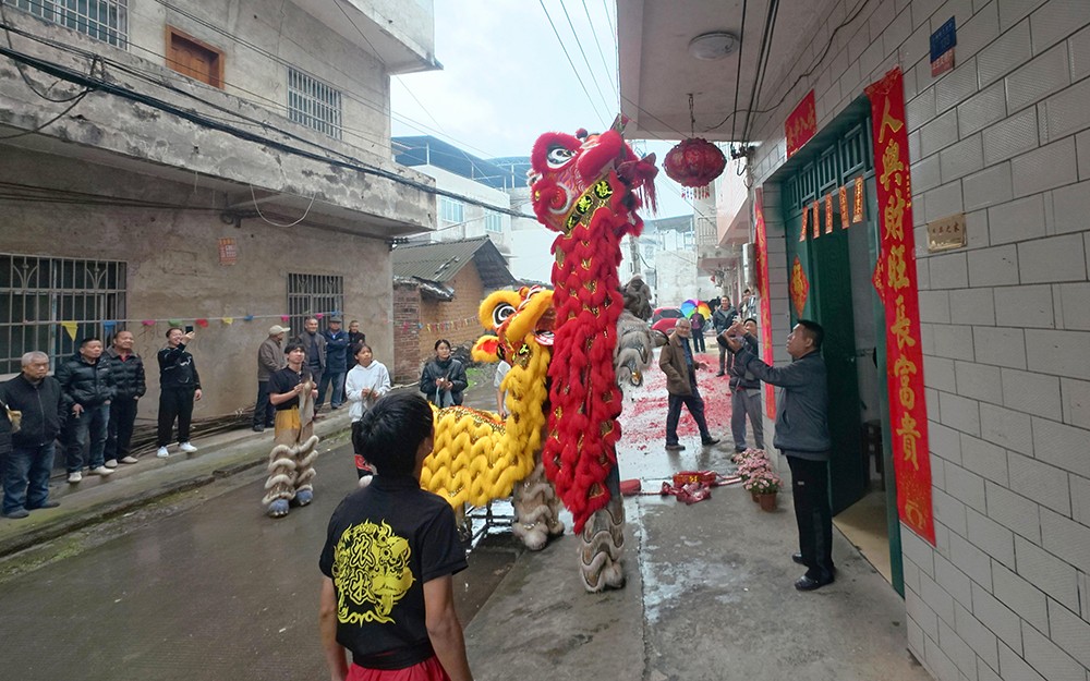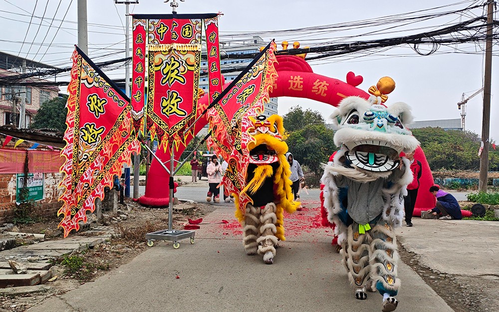 活动当天,新隆屯锣鼓喧天、热闹非凡。上午10时起,学校醒狮队队员身着传统服饰,在激昂的鼓点中先后表演了“高台饮水”“瑞狮吐福”等经典套路。队员们以精湛的技艺和饱满的热情,生动演绎了醒狮的威猛与灵动,赢得现场村民阵阵喝彩。祭拜仪式期间,醒狮队还配合村民完成巡游、祈福等环节,以传统民俗礼仪表达对风调雨顺、国泰民安的美好祝愿。整场活动气氛热烈而有序,充分展现了学校学子昂扬向上的精神风貌和传承优秀传统文化的责任担当。