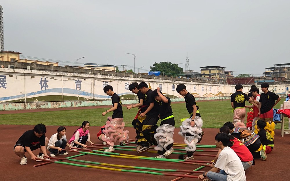 活动在学校舞狮队、民俗协会的精彩表演中拉开了帷幕。现场设置了投壶、拔河、跳竹竿、抛接绣球、三人板鞋等富有民族特色的体验项目。投壶区里,同学们屏息凝神、精准投掷;抛接绣球时,大家默契配合、欢声不断;三人两足项目中,搭档们步伐一致、齐心协力;跳竹竿区域,同学们随着竹竿开合节奏灵活跳跃,尽显青春活力;拔河比赛更是将现场气氛推向高潮,呐喊声、助威声此起彼伏。每个项目都吸引了众多学生参与,现场洋溢着浓浓的节日氛围和青春气息,大家都在欢乐中感受了壮乡文化的独特魅力。