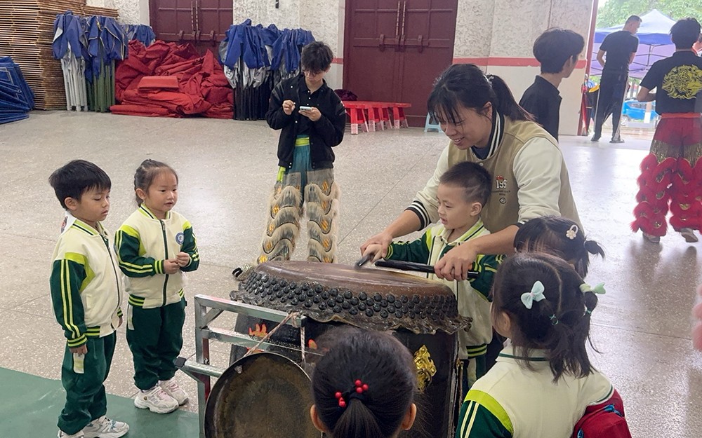 党员同志带领小朋友玩转舞狮打鼓技艺
