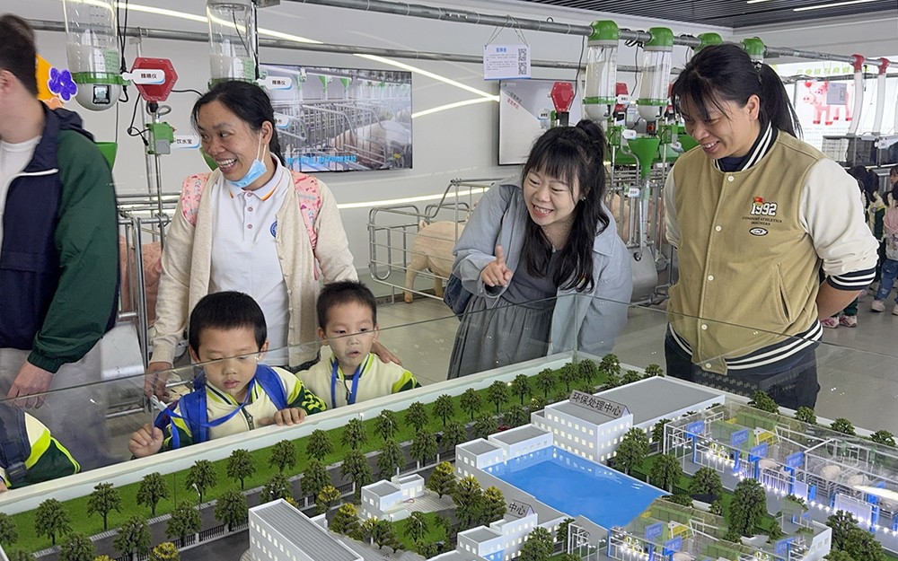 党员同志为小朋友介绍现代猪场的基建功能