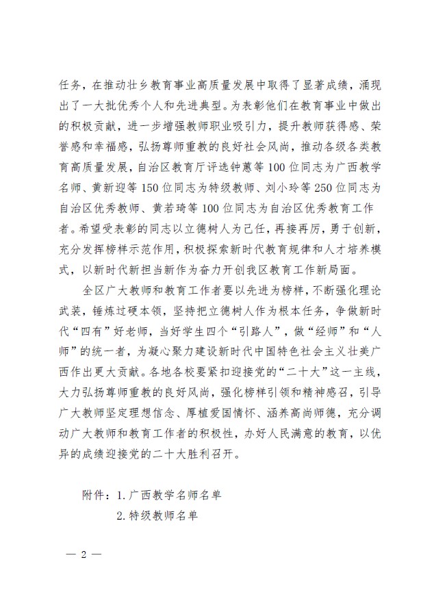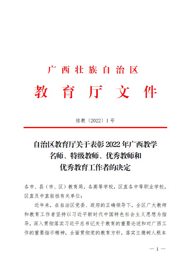 近日,自治区教育厅印发文件表彰2022年广西教学名师、特级教师、优秀教师和优秀教育工作者,我校党委书记、校长蒋漓生同志荣获自治区优秀教师称号。
