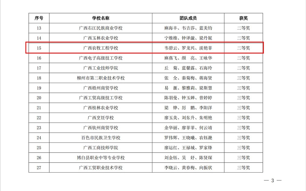 近日,自治区教育厅公布2022年广西中等职业学校班主任能力比赛获奖名单,我校参赛团队韦碧云、罗龙兴、淡艳菲荣获二等奖。