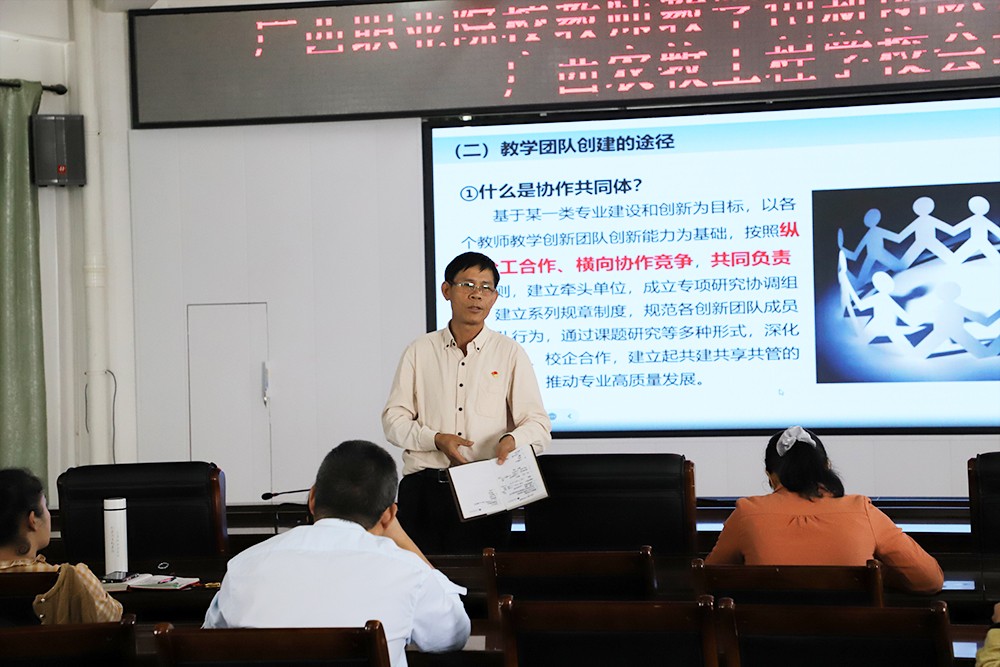 本次培训交流会上,国家级教学名师、全国模范教师、广西理工职业技术学校副校长陈良教授运用详实的数据和典型的案例分析教师教学创新团队立项条件、建设任务、建设机制和措施。通过分享国家级职业教育教师教学创新团队建设实例指导各教学团队如何撰写申报材料与建设实践。在培训中陈教授特别强调团队建设应与“三教”改革、专业建设、资源库建设、课程建设、产教融合、协同共同体建设等相结合。