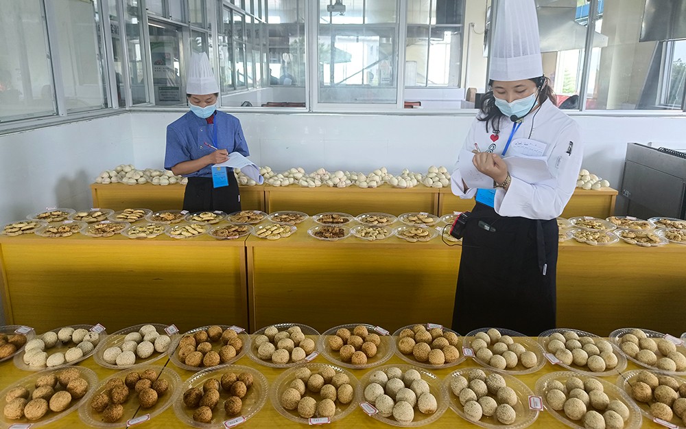 本次考试分为理论考试和实操考试两部分,针对考生制作粤式点心——寿桃包、甘露酥、香炸软枣的技能进行理论知识和实际操作考核。考核过程中,考生操作积极认真、有条不紊;考评员考评公平公正、科学规范。