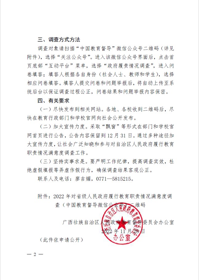 根据《自治区人民政府教育督导委员会办公室关于配合国务院教育督导委员会办公室做好2022年对自治区人民政府履行教育职责情况满意度调查的通知》(桂教督委办〔2022〕91号)文件精神,请我校广大师生积极参与对自治区人民政府履行教育职责情况满意度调查工作。具体操作请查看文件附件。