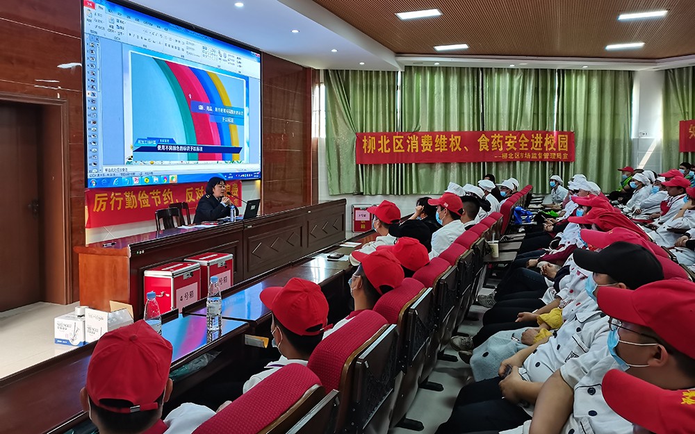 为做好新学期学校食品安全管理工作,提高食堂员工业务素质。3月2日下午,我校邀请柳州市柳北区市场监督管理局食品监管所罗文静所长来到学校授课,全校食品安全员、食堂从业人员、超市经营管理人员、部分师生代表参加学习培训。