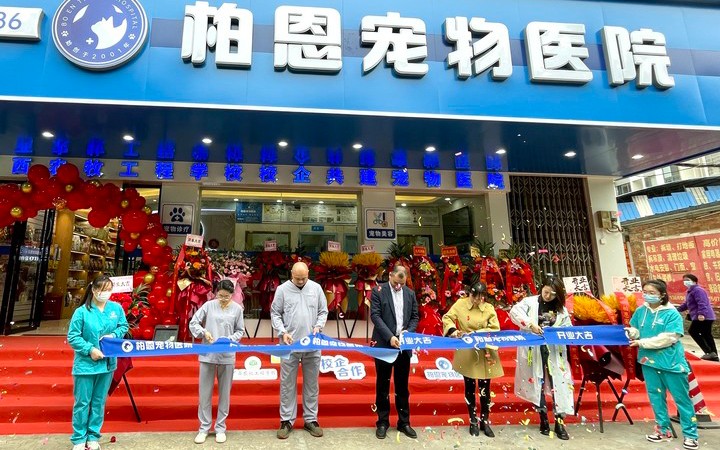 随后,蒋漓生校长、马翠芳副校长与企业领导共同进行剪彩与揭牌仪式,我校校企共建宠物医院-柏恩宠物医院正式开业!