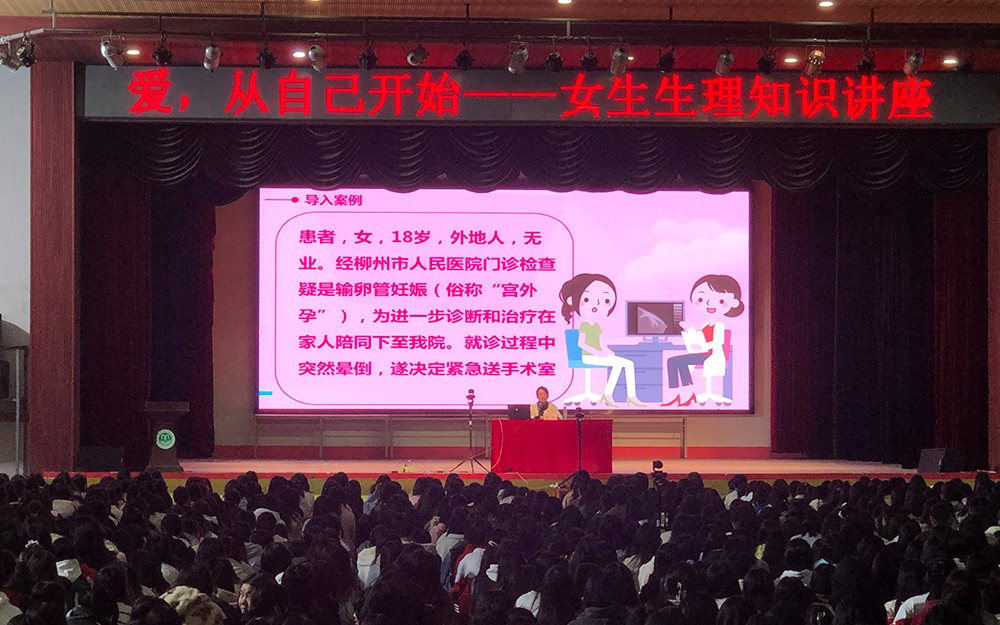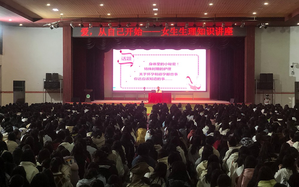 阳春三月,草长莺飞。为营造良好的校园青春健康氛围,进一步普及女生生理卫生健康知识,引导女生关注自我,促进身心健康,3月26日晚8:00,我校分别在大礼堂和阶梯教室两个会场同时组织全校1600多名在校女生开展女生系列活动——女生生理卫生健康知识讲座,为每一位女生打开青春的校园保护伞。本次讲座特别邀请了就于职广西科技大学第一附属医院妇产科莫燕医生为全体女生授课。