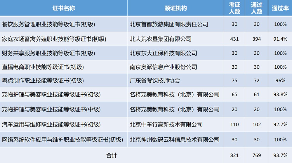 2022年,我校与组织机构密切合作,在校企共同努力下,学校先后举行了1+X家庭农场畜禽养殖(初级)、1+X汽车运用与维修、1+X粤点制作等九项职业技能等级证书考试,769名学生顺利取得职业技能等级证书。