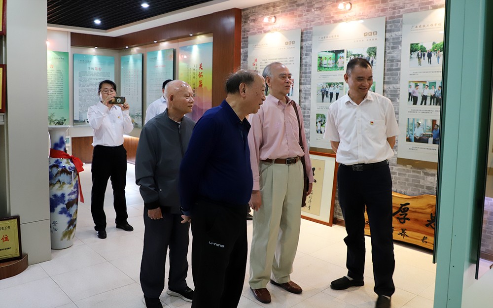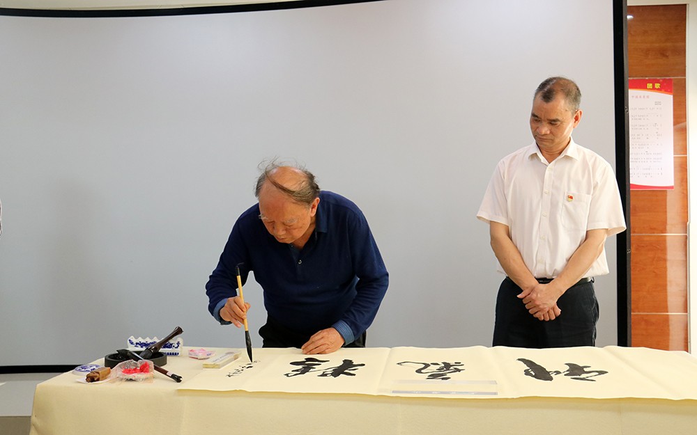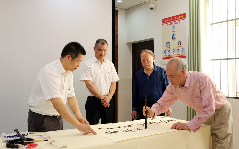 在参观校园后,杨政中、韦正宇分别进行现场书法展示,为学校留下珍贵墨宝。