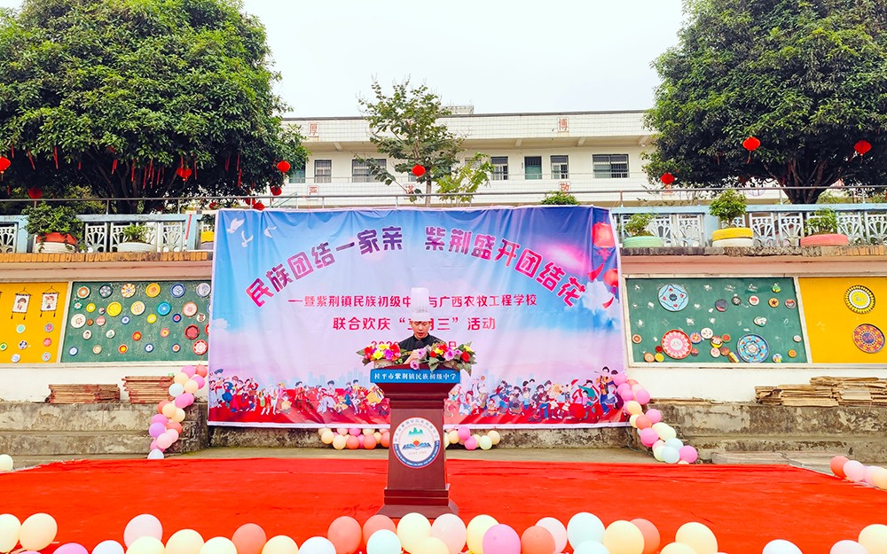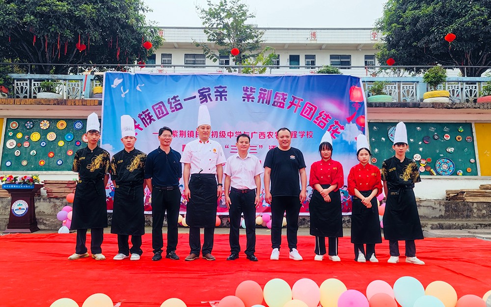 4月14日,我校受桂平市紫荆民族初中邀请,联合该校举办主题为“民族团结一家亲,紫荆盛开团结花”欢庆“壮族三月三”活动。招生就业办公室副主任罗鸣、刘彤及旅游商贸部中餐烹饪专业部分师生参加了此次活动。